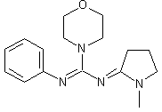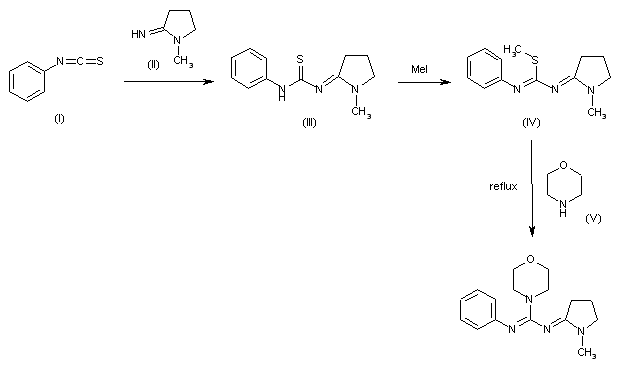 The reaction of phenyl isothiocyanate (I) with 2-imino-1-methyl pyrrolidine (II) in benzene gives N-(1-methyl-2-pyrrolidinylidene)-N'-phenylthiourea (III), which is treated with iodomethane in refluxing acetone to afford methyl N-1-methyl-2-pyrrolidinylidene)-N'-phenylcarbamidothioate (IV). Finally, this compound is treated with morpholine in refluxing isopropanol.