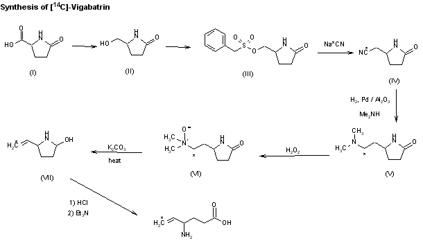 The synthesis of [14C]-labeled vigabatrin has been described: The reduction by known methods of pyroglutamic acid (I) to the alcohol (II) and its acylation with p-toluenesulfonyl chloride gives 5-(tosyloxymethyl)pyrrolidin-2-one (III), which by reaction with [14C]-labeled sodium cyanide in hot DMF yields 5-([14C]-cyanomethyl)pyrrolidin-2-one (IV). The reduction of (VI) with H2 over Pd/Al2O3 and treatment with dimethylamine affords 5-[2-(dimethylamino)ethyl]pyrrolidin-2-one (VI), which is oxidized with H2O2 in water to the N-oxide (VI). The treatment of (VI) with K2CO3 in refluxing xylene affords 5-([14C]-vinyl)pyrrolidin-2-one (VII), which is finally submitted to ring opening with hot 5 M aqueous HCl, followed by neutralization with triethylamine.
