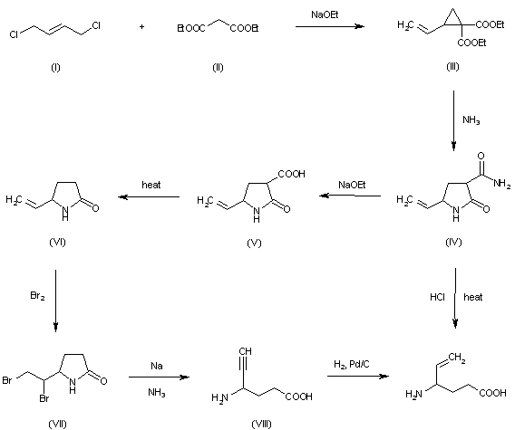 This compound can be prepared in two different ways: 1) The reaction of 1,4-dichloro-2-butene (I) with diethyl malonate (II) by means of sodium ethoxide in refluxing ethanol gives 1,1-bis(ethoxycarbonyl)-2-vinylcyclopropane (III), which by reaction with ammonia gas in DMF at 120 C is converted into 3-carboxamido-5-vinyl-2-pyrrolidone (IV). Finally, this compound is treated with concentrated HCl in refluxing acetic acid. 2) The treatment of (IV) with sodium ethoxide in refluxing ethanol gives 3-carboxy-5-vinyl-2-pyrrolidone (V), which is decarboxylated by treatment with refluxing acetic acid to afford 5-vinyl-2-pyrrolidone (VI). The bromination of (VI) with Br2 in CCl4 yields 5-(1,2-dibromoethyl)-2-pyrrolidone (VII), which by treatment with Na in liquid NH3 in a pressure vessel at 25 C is converted into 4-aminohex-5-inoic acid (VIII). Finally, this compound is partially reduced with H2 over a suitable catalyst.
