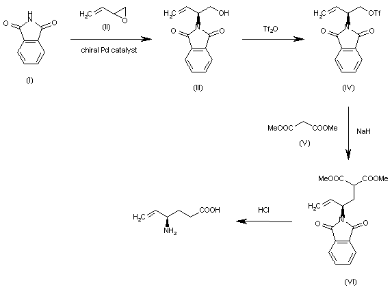The enantiocontrolled addition of phthalimide (I) to 1,3-butadiene monoepoxide (II) with a chiral palladium catalyst and Na2CO3 in dichloromethane gives N-(2-hydroxy-1(S)-vinylethyl)phthalimide (III), which is treated with triflic anhydride and TEA in dichloromethane to yield the triflate (IV). The condensation of (IV) with dimethyl malonate (V) by means of NaH in THF affords the alkylated malonate (VI), which is finally decarboxylated and deprotected by a treatment with aqueous refluxing HCl. Note that the synthesis of the biologically active (S)-enantiomer simply requires a change in the chirality of the Pd catalyst used in the first step of the synthesis.