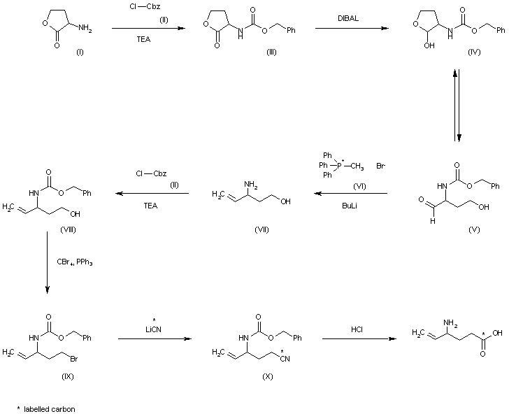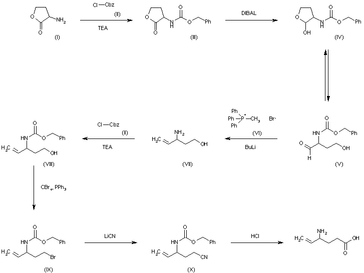 The reaction of 3-aminotetrahydrofuran-2-one (I) with benzyloxycarbonyl chloride (II) and TEA in chloroform gives the carbamate (III), which is reduced to the lactol (IV) by means of DIBAL in toluene. It has been observed that lactol (IV) is in equilibrium with its tautomeric open chain aldehydic form.(V). The reaction of (IV)??(V) with phosphonium bromide (VI) by means of Bu-Li in THF yields 3-amino-4-penten-1-ol (VII), which is reprotected with benzyloxycarbonyl chloride (II) and TEA to afford the carbamate (VIII). The reaction of (VIII) with CBr4 and PPh3 in dichloromethane provides the pentenyl bromide (IX), which is treated with LiCN in THF to give 4-(benzyloxycarbonylamino)-5-hexenenitrile (X). Finally this compound is hydrolyzed with conc. HCl to yield the target 4-amino-5-hexenoic acid.