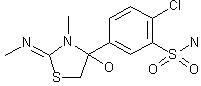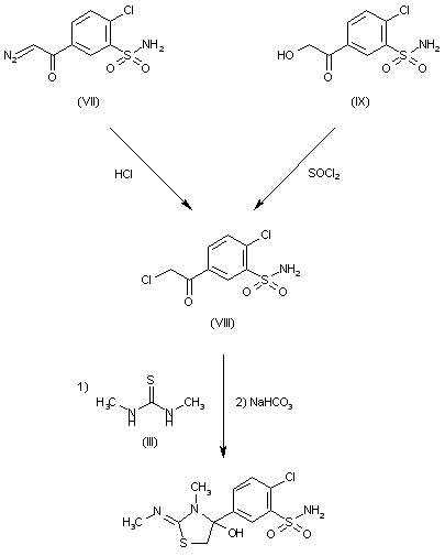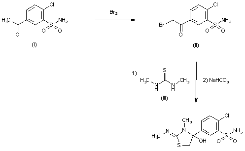 The bromination of 4-chloro-3-chlorosulfonylacetophenone (IV) with Br2 in ethyl acetate yields 4-chloro-3-chlorosulfonyl-alpha-bromoacetophenone (V), which is cyclized with N,N'-dimethylthiourea (III) affording 4-(4-chloro-3-chlorosulfonylphenyl)-3-methyl-2-(methylimino)-1,3-thiazolidin-4-ol (VI). Finally, this compound is treated with NH3 in methanol.