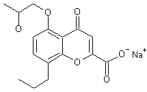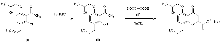 The hydrogenation of 2-hydroxy-3-allyl-6-(2-hydroxypropoxy)acetophenone (I) with H2 over Pd/C in ethanol gives 2-hydroxy-3-propyl-6-(2-hydroxypropoxy)acetophenone (II), which is then cyclized with diethyl oxalate (III) by means of sodium ethoxide in refluxing ethanol. The sodium salt is prepared by treatment of the acid with NaHCO3 in water.