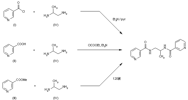 This compound can be obtained by three different ways: 1) By condensation of nicotinoyl chloride (I) with 1,2-diaminopropane (IV) by means of triethylamine in pyridine. 2) By reaction of nicotinic acid (II) with 1,2-diaminopropane (IV) by means of ethyl chloroformate and triethylamine in THF. 3) By heating at 120 C a mixture of methyl nicotinate (III) with 1,2-diaminopropane (IV).