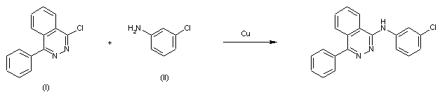 By condensation of 1-chloro-4-phenylphthalazine (I) with 3-chloroaniline (II) by means of powdered Cu at 100 C.