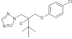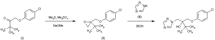 The reaction of 1-(4-chlorophenoxy)-3,3-dimethyl-2-butanone (I) with dimethyl sulfide, dimethyl sulfate and sodium methoxide in acetonitrile gives 2,4-chlorophenoxymethyl)-2-(tertbutyl)oxirane (II), which is then condensed with 1,2,4-triazole (III) in refluxing ethanol.
