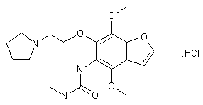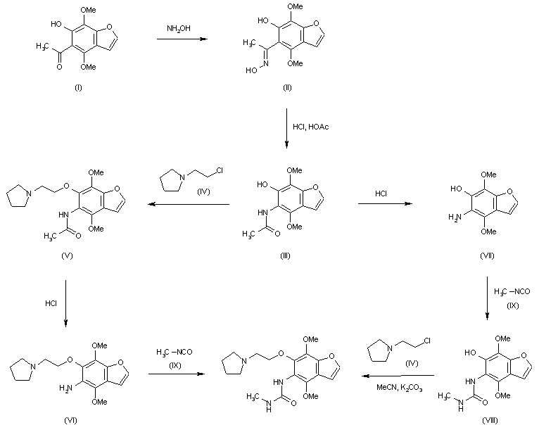 | 合成路线图解说明: The reaction of khellinone (I) with hydroxylamine in refluxing ethanol gives the corresponding oxime (II), which undergoes the Beckmann rearrangement in a saturated solution of gaseous HCl in acetic acid to afford the acetamido compound (III). Treatment of (III) with gaseous HCl in ethanol under reflux yields an aminophenol (VII), which is first reacted with methyl isocyanate (IX) in chloroform, then O-alkylated by pyrrolidinoethyl chloride (IV) in refluxing acetonitrile in the presence of K2CO3 to give carocainide as the free base. Alternatively, (III) can be alkylated by pyrrolidinoethyl chloride (IV), then refluxed in aqueous 2N HCl and the resulting amino compound (VI) reacted with methyl isocyanate (IX) in dry toluene. The hydrochloride can be prepared by treatment of the free base with HCl in methylene chloride-chlorotene. |