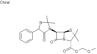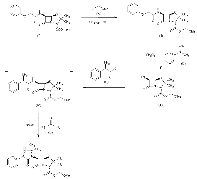 The esterification of potassium phenoxymethylpenicillanate (I) with chloromethyl methyl ether (A) in methylene chloride-THF gives the methoxymethyl ester of penicilline V (II), which is then treated with dimethylaniline (B) in CH2Cl2 to afford methoxymethyl 6-aminopenicillanate (III). Finally, this product is condensed with phenylglycyl chloride (C) hydrochloride and acetone (D) by means of NaOH.