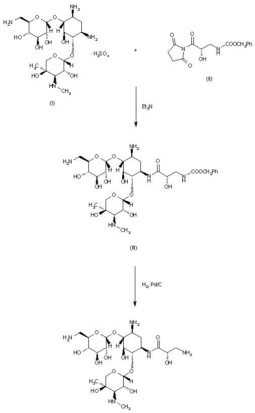 The reaction of gentamicin B sulfate (betamicin sulfate) (I) with N-(S-3-benzyloxycarbonylamino)-2-hydroxypropionylsuccinimide (II) by means of triethylamine in water-methanol-DMF gives 1-N-(S-3-benzyloxycarbonylamino-2-hydropropionyl)betamicin (III), which is finally hydrogenated with H2 over Pd/C in methanol-water.