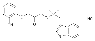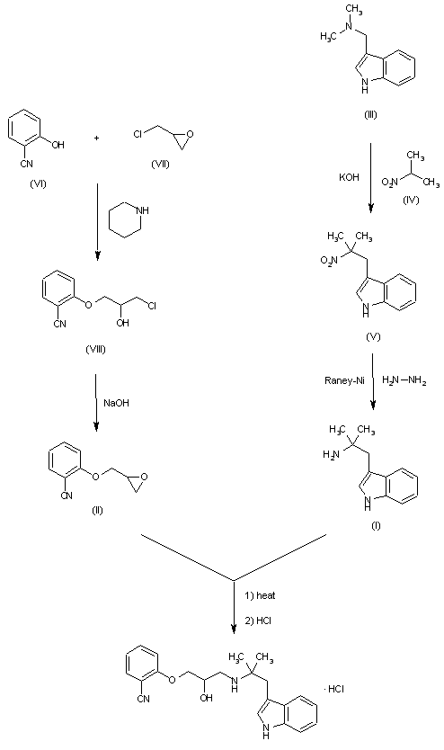 By reaction of 3-(2-methyl-2-aminopropyl)indole (I) and 2-(2,3-epoxypropoxy)benzonitrile (II) by heating at 120-40 C followed by a treatment with HCl in ethanol. The starting products are obtained as follows: 1) The reaction of 3-(dimethylaminomethyl)indole (III) with 2-nitropropane (IV) by means of KOH gives 3-(2-methyl-2-nitropropyl)indole (V), which is then reduced with hydrazine and Raney-Ni in ethanol to yield (I). 2) The reaction of 2-hydroxybenzonitrile (VI) with epichlorohydrin (VII) by means of piperidine affords 2-(3-chloro-2-hydroxypropoxy)benzonitrile (VIII), which is epoxidized again to (II) by treatment with NaOH in hot THF-water.