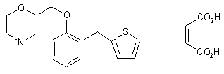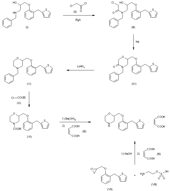 This compound can be obtained in two different ways: 1) The acylation of 1-benzylamino-3-[2-(2-thenyl)phenoxy]-2-propanol (I) with chloroacetyl chloride (II) by means of triethylamine in CHCl3 gives N-[2-hydroxy-3-[2-(2-thenyl)phenoxy)propyl]-N-benzylchloroacetamide (III), which is cyclized by treatment with sodium methoxide in refluxing methanol yielding N-benzyl-2-[2-(2-thenyl)phenoxymethyl]morpholin-5-one (IV). The reduction of (IV) with LiAlH4 in refluxing ether affords N-benzyl-2-[2-(2-thenyl)phenoxymethyl]morpholine (V), which is debenzylated by treatment with ethyl chlorotormate (A) in refluxing toluene giving N-ethoxycarbonyl-2-[2-(2-thenyl)phenoxymethyl]morpholine (VI). Finally, this compound is decarboxylated by treatment with barium hydroxide in refluxing water and treated with maleic acid (B). 2) By cyclization of 1-[2-(2-thenyl)phenoxy]-2,3-epoxypropane (VII) with 2-aminoethyl hydrogen sulfate (VIII) by means of NaOH in refluxing water. Finally, the resulting compound is treated with maleic acid (B).
