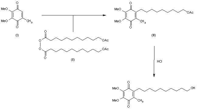 The radical alkylation of 2,3-dimethoxy-5-methylbenzoquinone (I) with bis(11-acetoxyundecanoyl)peroxide (II) at 85-90 C gives 2,3-dimethoxy-5-methyl-6-(10-acetoxydecyl)benzoquinone (III), which is hydrolyzed with concentrated HCl in methanol.