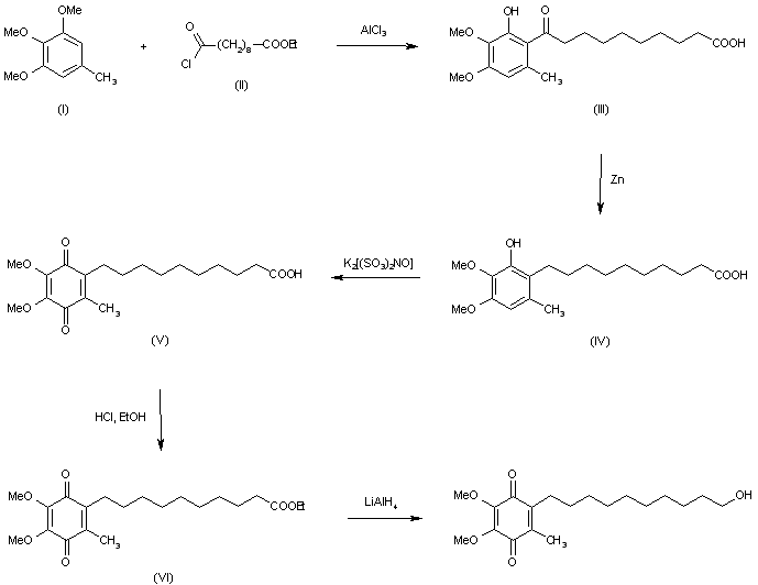 The Friedel-Kraft condensation of 3,4,5-trimethoxytoluene (I) with ethyl 9-chloroformylnonanoate (II) by means of AlCl3 in nitrobenzene gives 9-(2-hydroxy-3,4-dimethoxy-6-methylbenzoyl)nonanoic acid (III), which is reduced with Zn in refluxing aqueous HCl yielding 10-(2-hydroxy-3,4-dimethoxy-6-methylphenyl)decanoic acid (IV). The oxidation of (IV) with potassium nitrosodisulfonate in water-acetone affords 2,3-dimethoxy-5-methyl-6-(9-carboxynonyl)benzoquinone (V), which is esterified with ethanol HCl to the corresponding ethyl ester (VI). Finally, this compound is reduced with LiAlH4 in ether.