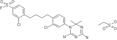 The reaction of 2-chloro-4-fluorosulfonylbenzyl bromide (I) with triphenylphosphine (II) in refluxing benzene gives the corresponding triphenylphosphonium bromide (III), which is submitted to a Wittig condensation with 2-chloro-4-nitrocinnamaldehyde (IV) [prepared by an aldol condensation of 2-chloro-4-nitrobenzaldehyde (V) and acetaldehyde (VI)] yielding 1-(4-fluorosulfonyl-2-chlorophenyl)-4-(2-chloro-4-nitrophenyl)butadiene (VII). The reduction of (VII) with H2 over PtO2 in methoxyethanol affords 1-(4-fluorosulfonyl-2-chlorophenyl)-4-(2-chloro-4-aminophenyl)butane (VIII), which is finally cyclized with cyanoguanidine (IX) and acetone and treated with ethanesultonic acid.