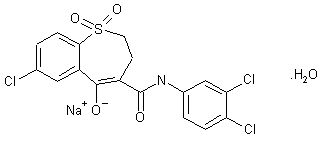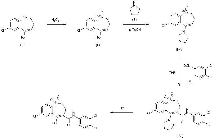 The oxidation of 7-chloro-5-hydroxy-2,3-dihydro-1-benzothiepin (I) with H2O2 in acetic acid - water gives 7-chloro-5-hydroxy-2,3-dihydro-1-benzothiepin-1,1-dioxide (II), which by reaction with pyrrolidine (III) and p-toluenesulfonic acid in refluxing benzene is converted into 7-chloro-5-pyrrolidino-2,3-dihydro-1-benzothiepin-1,1-dioxide (IV). The condensation of (IV) with 3,4-dichlorophenyl isocyanate (V) in hot THF yields N-(3,4-dichlorophenyl)-7-chloro-5-pyrrolidino-2,3-dihydro-1-benzothiepin-4-carboxamide-1,1-dioxide (VI), which is finally hydrolyzed with HCl in refluxing ethanol - water.