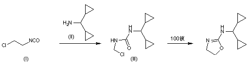 The addition of dicyclopropylmethylamine (II) to B-chloroethyl isocyanate (I) in THF gives N-(dicyclopropylmethyl)-N'-(Beta-chloroethyl)urea (III), which is then cyclized in refluxing water.