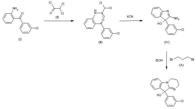 The reaction of 2-amino-3'-chlorobenzophenone (I) with dichloroacetyl chloride (II) in acetone gives o-(m'-chlorobenzoyl)-2,2-dichloroacetanilide (III), which is cyclized with potassium cyanide in water yielding 2-amino-3-(m-chlorophenyl-3H-indol-3-ol (IV). Finally, this compound is condensed with 1,3-dibromopropane (A) in refluxing ethanol.