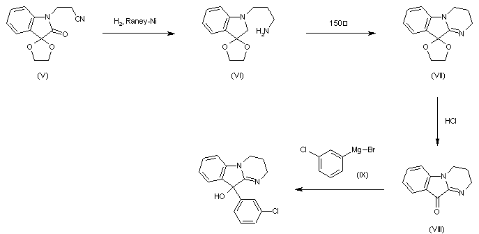 The reduction of 2'-oxospiro-(1,3-dioxolane-2,3'-indoline)-1'-propionitrile (V) with H2 over Raney-Ni in NH3 saturated ethanol gives 2'-oxospiro-(1,3-dioxolane-2,3'-indoline)-1'-propanamine (VI), which, without isolation, is cyclized in refluxing xylene yielding 3',4'-dihydrospiro[1,3-dioxolane-2,10'(2H,10H)pyrimido-[1,2-a]indole] (VII). The hydrolysis of (VII) with aqueous HCl at 85 C affords 3,4-dihydropyrimido[1,2-a]indole-10(2H)-one (VIII), which is finally treated with m-chlorophenylmagnesium bromide (IX) in refluxing ethyl ether.