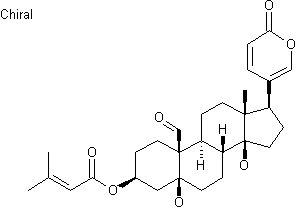 Acrihellin has been synthesized by acylation of Hellebrigenin (I) with 3,3-dimethylacrylic acid chloride (II) in refluxing methylene chloride.