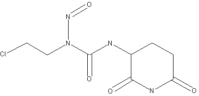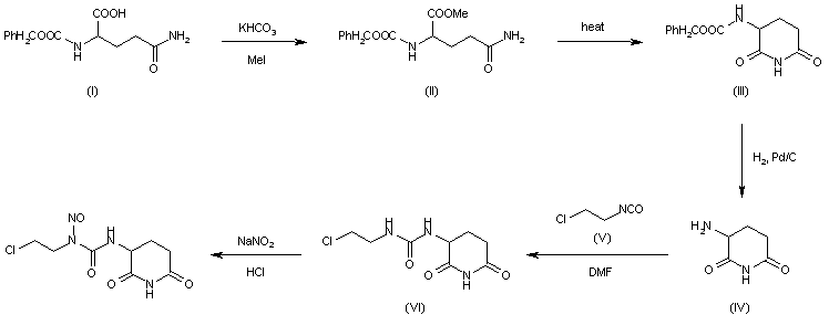 The esterification of N2-(benzyloxycarbonyl)-D,L-glutamine (I) with methyl iodide and KHCO3 in DMF gives the corresponding methyl ester (II), which is cyclized to benzyl D,L-2,6-dioxo-3-piperidinecarbamate (III) by heating. The hydrogenolysis of (III) with H2 over Pd/C in methanol yields D,L-2-aminoglutarimide (IV), which is condensed with 2-chloroethyl isocyanate (V) in DMF affording 1-(2-chloroethyl)-3-(2,6-dioxo-3-piperidyl)urea (VI). Finally, this compound is nitrosated in the usual way with NaNO2 in formic acid.