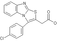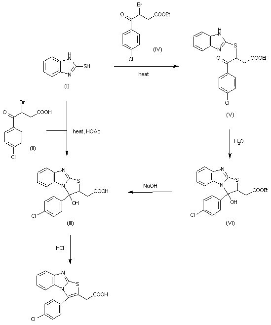 This compound can be obtained in two different ways, both starting from 2-mercaptobenzimidazole (I): 1) The cyclization of (I) with 3-bromo-3-(p-chlorobenzoyl)propionic acid (II) in acetic acid at 100 C gives 3-(p-chlorophenyl)-2,3-dihydro-3-hydroxythiazolo[3,2-a]benzimidazole-2-acetic acid (III), which is dehydrated by means of HCl in refluxing dioxane. 2) The condensation of (I) with ethyl 3-bromo-3-(p-chlorobenzoyl)propionate (IV) in refluxing ethanol gives 3-(benzimidazol-2-ylthio)-3-(p-chlorobenzoyl)propionic acid ethyl ester (V), which is cyclized by treatment with water yielding 3-(p-chlorophenyl)-2,3-dihydro-3-hydroxythiazolo[3,2-a]benzimidazole-2-acetic acid ethyl ester (VI). This compound is then hydrolyzed by treatment with NaOH in hot water to afford (III).