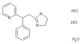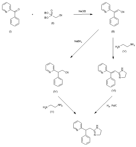 This compound can be obtained by two related ways: 1) The Wittig condensation of 2-benzoylpyridine (I) with diethyl cyanomethylphosphonate (II) by means of sodium ethoxide in hot ethanol gives 3-phenyl-3-(2-pyridyl)acrylonitrite (III), which is reduced with NaBH4 in refluxing ethanol to yield 3-phenyl-3-(2-pyridyl)propionitrite (IV). Finally, this compound is cyclized with ethylenediamine (V) at reflux temperature. 2) The cyctization of 3-phenyl-3-(2-pyridyl)acrylonitrite (III) with ethylenediamine (V) at reflux temperature gives 2-[2-phenyl-2-(2-pyridyl)viny]-2-imidazoline (VI), which is then reduced with H2 over Pd/C in ethanol.