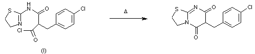 By thermal cyclization of 2-[2-(chlorocarbonyl)-3-(4-chlorophenyl)propionylamino]-2-thiazoline (I).