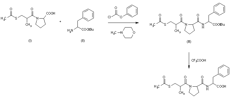 The condensation of 1-(D-3-acetylthio-2-methylpropanoyl)-L-proline (I) with L-phenylalanine tert-butyl ester (II) by means of N-methylmorpholine and phenyl chloroformate in THF gives 1-(D-3-acetyl-thio-2-methylpropanoyl)-L-prolyl-L-phenylalanine tert-butyl ester (III), which is hydrolyzed with trifluoroacetic acid in anisole.