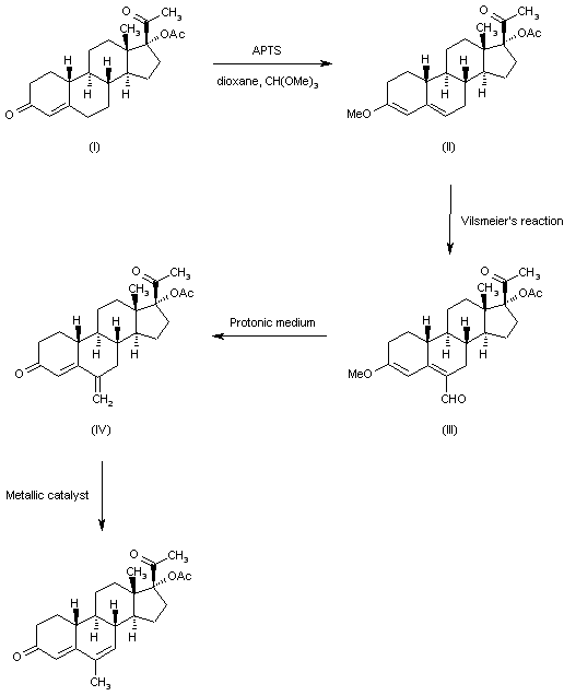 Enol etherification of 17(alpha)-acetoxy-19-norprogesterone (I) by methyl orthoformate and p-toluene sulfonic acid in dioxan, followed by Vilsmeier's reaction with dimethylformamide and phosphorus oxychloride. After reduction and dehydration with strong acid, the 6-methylene group is isomerized by metallic catalyst to obtain 17(alpha)-acetoxy-19-norpregna-4,6-diene-3,20-dione.