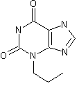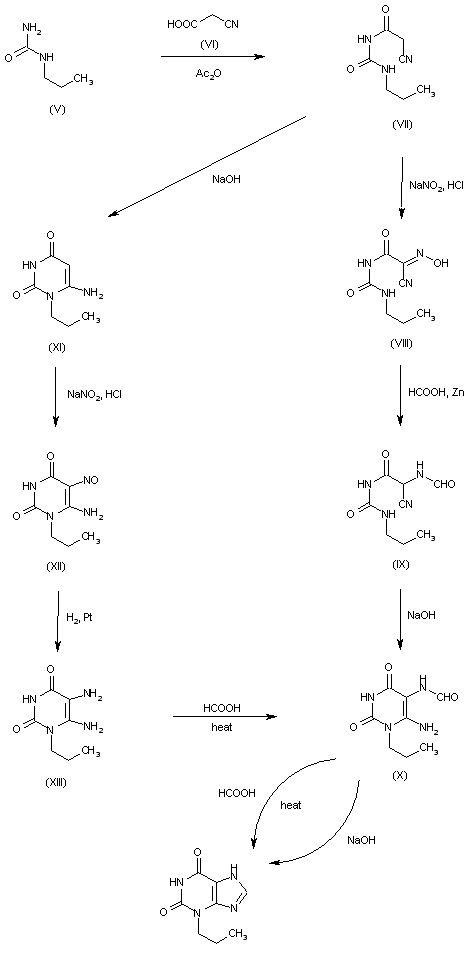 The reaction of N-propylurea (V) with cyanacetic acid (VI) in hot acetic anhydride gives N-propyl-N'-cyanacetylurea (VII), which is nitrosated with NaNO2 - HCl yielding the isonitroso derivative (VIII). The reduction and simultaneous formylation of (VIII) with Zn in formic acid affords the formylamino compound (IX), which is cyclized by treatment with NaOH to give 6-amino-5-formylamino-1-propylpyrimidine-2,4-dione (X). Finally, this compound is cyclized by treatment with refluxing formic acid. The cyclization of (VII) with NaOH in hot water gives 6-amino-1-propylpyrimidine-2,4-dione (XI), which is nitrosated with NaNO2 - HCl as usual yielding 6-amino-nitroso-1-propylpyrimidine-2,4-dione (XII). The reduction of (XII) with H2 over Pt in DMF affords 5,6-diamino-1-propylpyrimidine-2,4-dione (XIII), which is finally formylated with refluxing formic acid to (X). This compound can also be finally cyclized by treatment with NaOH in refluxing water.