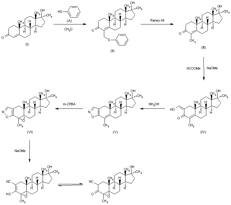The reaction of 17beta-hydroxy-17-methylandrost-4-en-3-one (I) with thiophenol (A) and formaldehyde by means of triethylamine in refluxing ethanol gives 17beta-hydroxy-17-methy-4-(phenylthiomethyl)androst-4-en-3-one (II), which is desulfurized by treatment with Raney-Ni in water yielding 17beta-hydroxy-4,17-dimethylandrost-4-en-3-one (III). The reaction of (III) with methyl formate by means of sodium methoxide in methanol affords 17beta-hydroxy-4,17-dimethyl-2-hydroxymethyleneandrost-4-en-3-one (IV), which by cyclization with hydroxylamine in acetic acid-sodium acetate is converted into 4,17-dimethylandrosta-2,4-dieno[2,3-d]isoxazol-17beta-ol (V). The epoxidation of (V) with m-chloroperbenzoic acid in methylene chloride gives 4alpha,5alpha-epoxy-4,17-dimethylandrost-2-eno [2,3-d]isoxazol-17beta-ol (VI), which is finally isomerized by treatment with sodium methoxide in THF.
