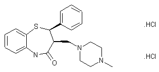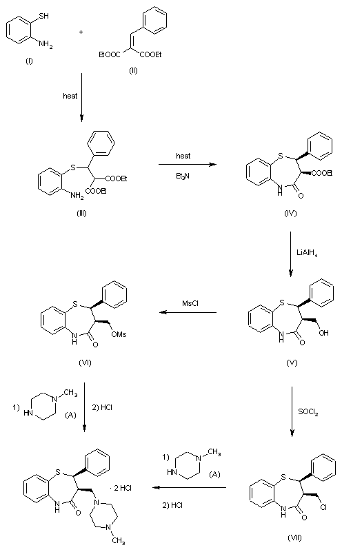 The reaction of 2-aminothiophenol (I) with diethyl benzylidenemalonate (II) by heating at 90 C gives diethyl 2-(2-aminophenylthio)-2-phenylethane-1,1-dicarboxylate (III), which is cyclized by heating at 180 C with triethylamine hydrochloride yielding 2,3-dihydro-3-ethoxycarbonyl-2-phenyl-1,5-benzothiazepin-4(5H)-one (IV). The reduction of (IV) with LiAlH4 in THF affords 2,3-dihydro-3-hydroxymethyl-2-phenyl-1,5-benzothiazepin-4(5H)-one (V), which by reaction with SOCl2 in refluxing benzene is converted into 2,3-dihydro-3-chloromethyl-2-phenyl-1,5-benzothiazepin-4(5H)-one (VII). Finally, this compound is treated with N-methylpiperazine at reflux temperature, and acidified with HCl. An alternative way is the reaction of (V) with methanesulfonyl chloride in pyridine affording 2,3-dihydro-3-methanesulfonyloxymethyl-2-phenyl-1,5-benzothiazepin-4(5H)-one (VI), which is then treated with N-methylpiperazine and HCl as before.