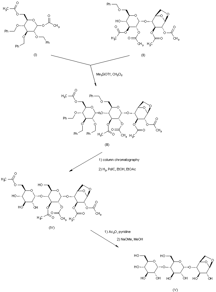 The total synthesis of acarbose has been reported. Condensation 1,6-di-O-acetyl-2,3,4-tri-O-benzyl-D-glucopyranose (I) with the protected 1,6-anhydromaltose (II) in the presence of trimethylsilyl triflate gave trisaccharide (III) as a mixture of epimers at position 1". Hydrogenolysis of the desired isomer using Pd/C furnished the debenzylated trisaccharide (IV). After conversion of (IV) to the corresponding nona-acetate and chromatographic purification, deacetylation with sodium methoxide in MeOH afforded 1,6-anhydromaltotriose (V).