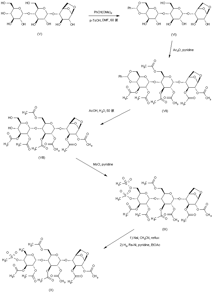 Monobenzylidenation of (V) was carried out by treatment with benzaldehyde dimethyl acetal and p-toluenesulfonic acid to give the 4,6-cyclic acetal (VI), which was further acetylated to the hepta-acetate (VII). Diol (VIII), obtained by acidic hydrolysis of the benzylidene acetal (VII), was treated with methanesulfonyl chloride in pyridine to furnish the bis-mesylate (IX). Displacement of the primary mesylate group of (IX) with NaI in refluxing acetonitrile produced the corresponding alkyl iodide, which was further reduced to the 6-deoxy derivative (X) by hydrogenolysis in the presence of Raney nickel.