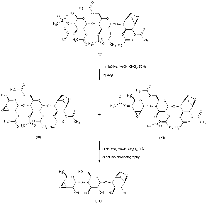 Treatment of mesylate (X) with methanolic sodium methoxide produced, after reacetylation, the desired 3,4-epoxide (XI) along with the 2,3-epoxide byproduct (XII). The mixture of epoxides was then deacetylated with methanolic sodium methoxide, yielding epoxide (XIII) as the major product.