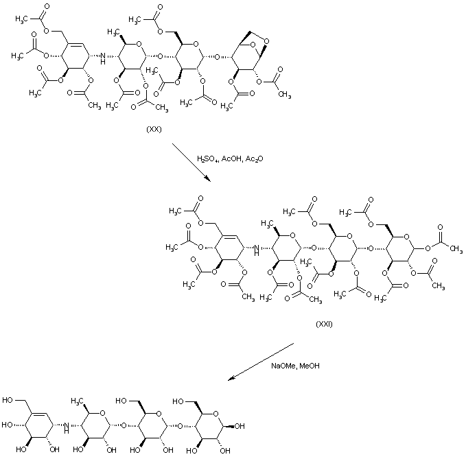 Acetolysis of (XX) was carried out by using a mixture of Ac2O, HOAc and H2SO4 to yield the acarbose peracetate ester (XXI). The title compound was finally obtained by methanolysis of the ester groups of (XXI) in the presence of sodium methoxide.