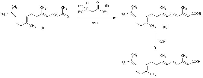 The Wittig condensation of 6,10,14-trimethylpentadeca-3,5,9,13-tetraen-2-one (I) with triethyl phosphonoacetate (II) by means of NaH in refluxing hexane gives ethyl 3,7,11,15-tetramethyl-2,4,6,10,14-hexadecapentaenoate (III), which is then hydrolyzed with KOH in hot isopropanol.