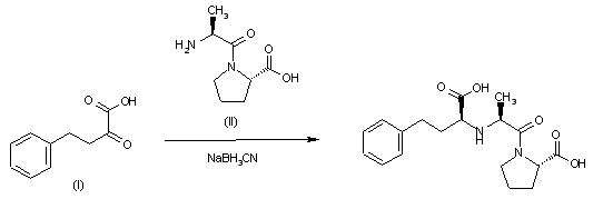 by reductocondensation of 4-phenyl-2-oxo butyric acid (IX) with L-alanyl-L-proline (IV) by means of sodium cyanoborohydride and NaOH in water.