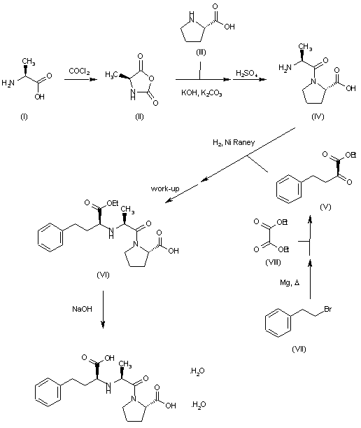Treatment of alanine (I) with phosgene in THF provides N-carboxyanhydride derivative (II), which is then coupled to proline (III) by means of KOH and K2CO3 in THF/H2O or acetonitrile to provide dipeptide (IV). Coupling of (IV) to ethyl 2-oxo-4-phenylbutyrate (V) by means of H2 over Raney-Ni in EtOH (or EtOH/HOAc), followed by the corresponding work-up for isomer separation, yields derivative (VI). (In turn, ketoester (V) can be obtained by treatment of 2-phenylethyl bromide (VII) with Mg turnings in refluxing THF, followed by reaction of the resulting Grignard reagent with diethyl oxalate (VIII) in THF). Finally, the desired product is obtained by saponification of the ethyl ester group of (VI) with NaOH.