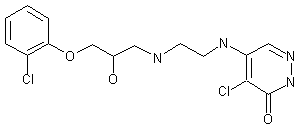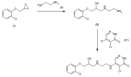 The condensation of 2-glycidyloxy-1-chlorobenzene (I) with ethylenediamine (II) in refluxing ethanol gives N-[3-(2-chlorophenoxy)-2-hydroxy propyl]ethylenediamine (III), which is then condensed with 4,5-dichloropyridazinone (IV) in refluxing ethanol.
