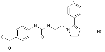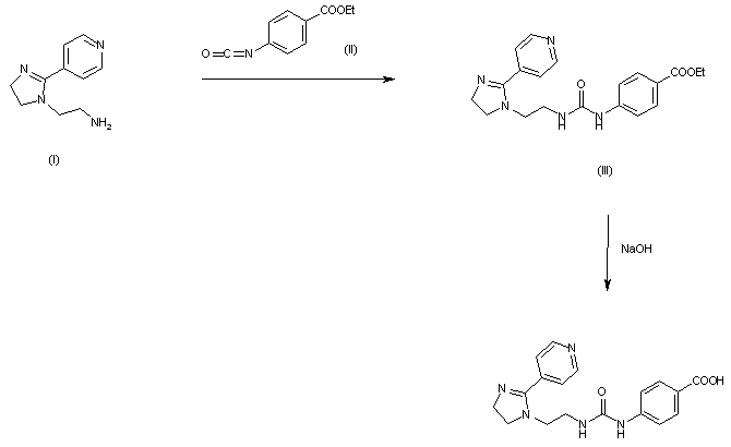 The condensation of 1-(2-aminoethyt)-2-(4 pyridyl)-2-imidazoline (I) with 4-(ethoxycarbonyl)phenyi isocyanate (II) gives the corresponding urea (III), which is hydrolyzed with NaOH in 95% ethanol.