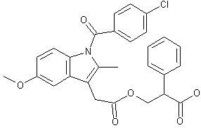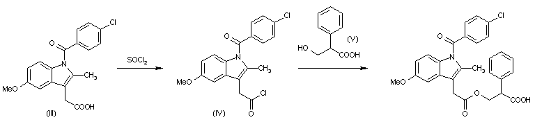 2) The reaction of indomethacin (III) with thionyl chloride in hot toluene gives the corresponding acyl chloride (IV), which is then condensed with tropic acid (V) in refluxing toluene containing pyridine to afford title compound.