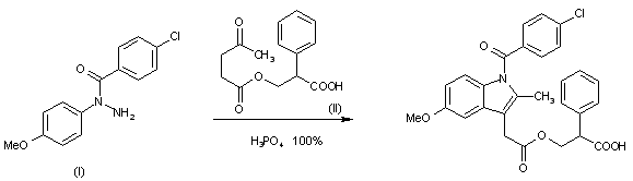 1) The reaction of N1-(4-chlorobenzoyl)-N1-(4-methoxyphenyl)hydrazine (I) [the starting material for the synthesis of indomethacin], with d,l-(2-carboxyethyl-2-phenyl)-4-oxopentanoate (II) under the conditions of Fischer indole synthesis by means of 100% phosphoric acid in toluene at 100 C. d,l-(2-Carboxyethyl-2-phenyl)-4-oxopentanoate (II) is obtained hy treatment of d,l-tropic acid with levulinic acid chloride.