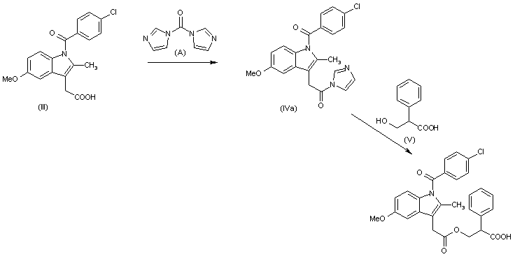 3) The treatment of indomethacin (III) with 1,1'-carbonyldiimidazole (A) at room temperature in dichloromethane affords the imidazolide (IVa), which is reacted with tropic acid (V) under the same mild conditions to afford title compound.