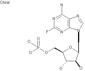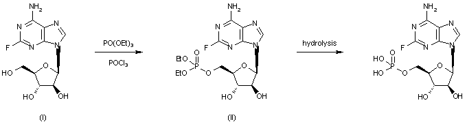 The reaction of 9-beta-D-arabinofuranosyl-2-fluoroadenine (I) with triethyl phosphate and POCl3 gives 9-beta-D-arabinofuranosyl-2-fluoroadenine-5'-(diethylphosphate) (II), which is hydrolyzed with Domez 1x8 (formated form) resin.