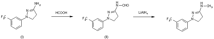 The reaction of 3-amino-1-(3-trifluoromothylphenyl)-2-pyrazoline (I) with formic acid gives the corresponding N-formyl derivative (II), which is then reduced with LiAlH4 in ether.