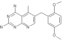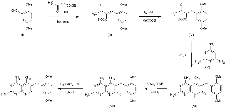 The reaction of 2,5-dimethoxybenzaldehyde (I) with ethyl acetoacetate (II) in a mixture of piperidine and glacial acetic acid in refluxing benzene gives ethyl alpha-acetyl-beta-(2,5-dimethoxyphenyl)acrylate (III), which is hydrogenated in a Parr low-pressure apparatus using 5% palladium on charcoal catalyst in ethyl acetate to yield ethyl alpha-acetyl-(2,5-dimethoxyphenyl)propionate (IV). The condensation of the propionate (IV) with 2,4.6-triaminopyrimidine in diphenylether at 195-230 C provides 2,4-diamino-7,8-dihydro-6-(2,5-dimethoxybenzyl)-5-methyl-7-oxopyrido[2,3-d]pyrimidine (VI). The key intermediate (VI) is converted to the 7-chloro compound (VII) by treatment with a 1:1 complex of N,N-dimethylformamide thionyl chloride, and finally (VII) is hydrogenolyzed with palladium on charcoal in the presence of potassium hydroxide to yield BW-301 U.