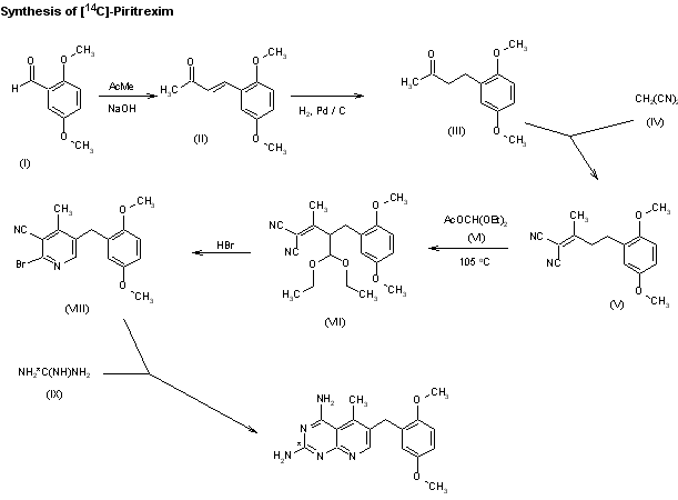 The synthesis of [14C]-labeled piritrexim has been described: The condensation of 2,5-dimethoxybenzaldehyde (I) with acetone in aqueous NaOH gives 4-(2,5-dimethoxyphenyl)-3-(E)-buten-2-one (II), which is hydrogenated with H2 over Pd/C in methanol to give 4-(2,5-dimethoxyphenyl)-2-butanone (III). The condensation of (III) with malononitrile (IV) by means of acetic acid-sodium acetate in refluxing toluene yields 2-cyano-5-(2,5-dimethoxyphenyl)-3-methyl-2-pentenenitrile (V), which is condensed with acetic acid diethoxymethyl ester (VI) at 105 C to afford the corresponding diethoxymethyl derivative (VII). The cyclization of (VII) with 32% HBr in acetic acid affords 2-bromo-5-(2,5-dimethoxybenzyl)-4-methylpyridine-3-carbonitrile (VIII), which is finally cyclized again with [14C]-labeled guanidine (IX) by means of NaH in refluxing tert-butyl alcohol.