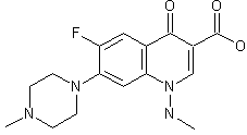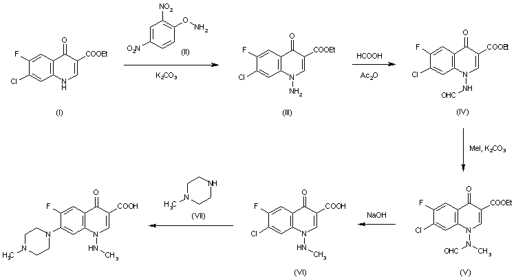 The reaction of ethyl 7-chloro-6-fluoro-1,4-dihydro-4-oxo-3-quinolinecarboxylate (I) with O-(2,4-dinitrophenyl)hydroxylamine (II) by means of K2CO3 in DMF gives ethyl 1-amino-6-fluoro-7-chloro-1,4-dihydro-4-oxo-3-quinolinecarboxylate (III), which is formylated with HCOOH in acetic anhydride yielding the corresponding 1-(formylamino) compound (IV). The methylation of (IV) with MeI and K2CO3 in DMF affords the 1-(formylmethylamino) compound (V), which is hydrolyzed with NaOH in refluxing water to give 7-chloro-6-fluoro-1,4-dihydro-4-oxo-1-(methylamino)quinoline-3-carboxylic acid (VI). Finally, this compound is condensed with N-methylpiperazine (VII) in refluxing pyridine.