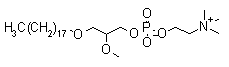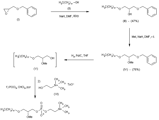 The reaction of (R)-O-benzylglycidol (I) with octadecanol (II) by means of NaH in hot DMF gives (R)-1-(benzyloxy)-3-(octadecyloxy)-2-propanol (III), which is methylated with methyl iodide and NaH in DMF yielding the corresponding methyl ether (IV). The debenzylation of (IV) with H2 over Pd/C in THF affords the primary alcohol (V), which is finally treated with POCl3/pyridine in CHCl3 and condensed with choline tosylate (VI) to furnish the target phosphorylcholine derivative.